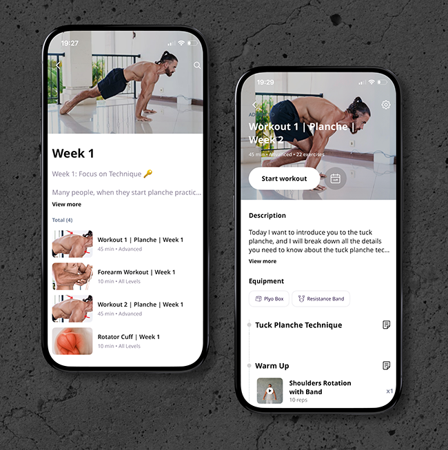 2×45-min planche workouts plus quick 10-minute injury prevention sessions. Clear weekly progression you can follow.